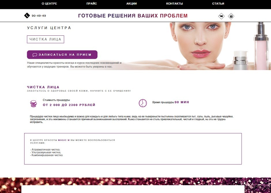 mm48.ruПоддержание молодости и красоты вместе с Magic M, именно здесь можно окунуться в индустрию красоты, отдав уход за собой в руки к профессионалам. Салон красоты предлагает четкий прайс-лист и подробное описание каждой косметической процедуры. Полный комплекс услуг направленных на омоложение, оздоровление и подержание естественной красоты. Вы можете выбрать вариант уходовой процедуры и способ применения техники. Для уточнения деталей можно обратиться к администратору. Инъекции красоты и акционные предложения для первых посетителей и постоянных клиентов.
