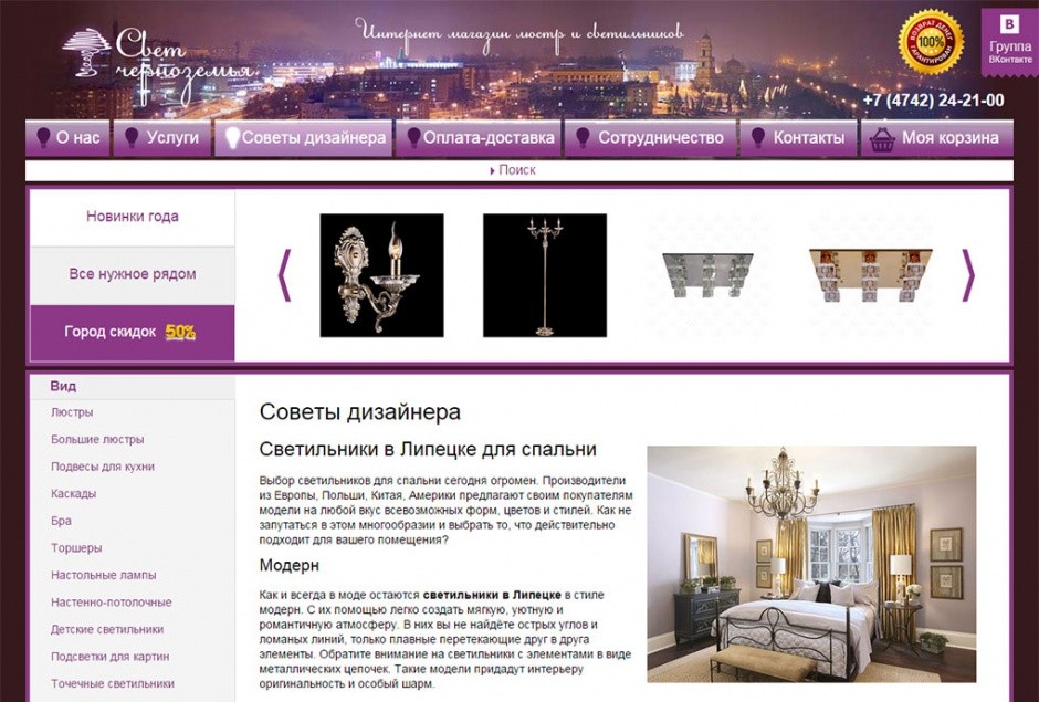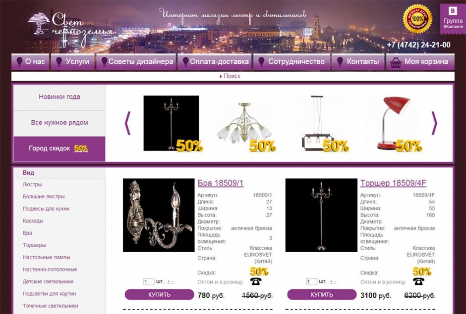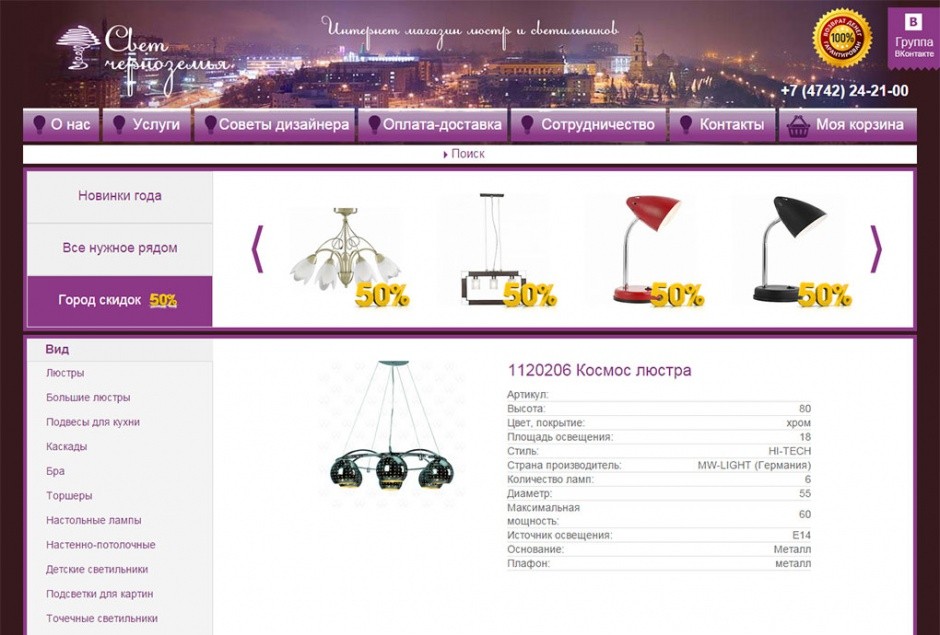 Интернет-магазин «Свет Черноземья» предоставляет широкий выбор осветительных приборов любого дизайна, назначения и габаритных размеров. Среди каталога можно приобрести роскошные люстры для небольших помещений, а также многоярусных потолков. Различные подвесы для кухни и настенно-потолочные светильники. Точечное освещение, настольные и напольные лампы. Огромный выбор и все категории оптимального освещения, как в темных комнатах, так и в стенах, где хорошее естественное освещение. Квалифицированные менеджеры готовы в любой момент помочь с выбором, основываясь на предпочтительных характеристиках и требуемом уровне освещения. Выбранные изделия надежно упаковываются и готовы к доставке уже в день покупки. Весь ассортимент всегда в наличии, актуальная цена и выгодные акционные предложения – все это магазин «Свет Черноземья».