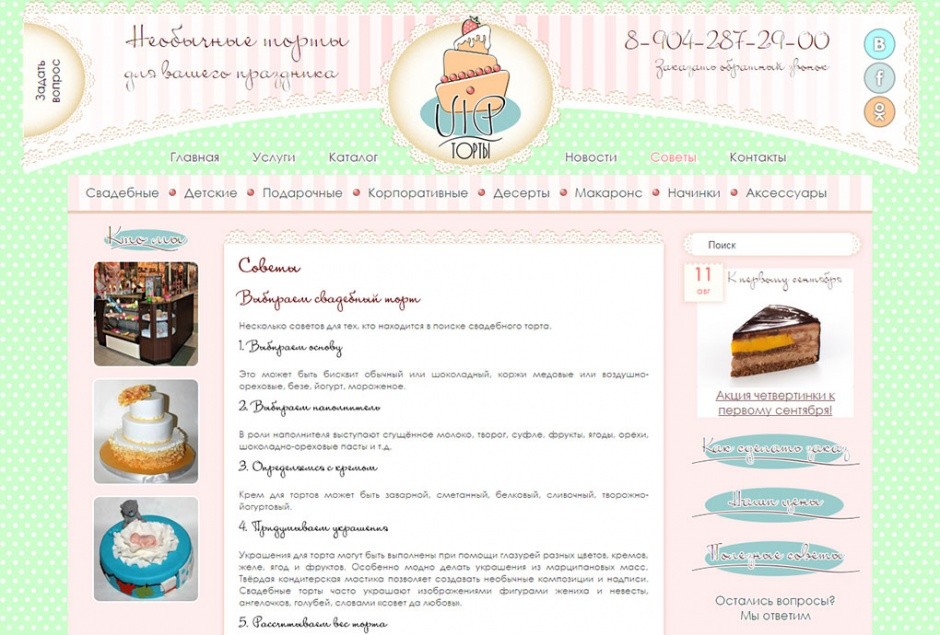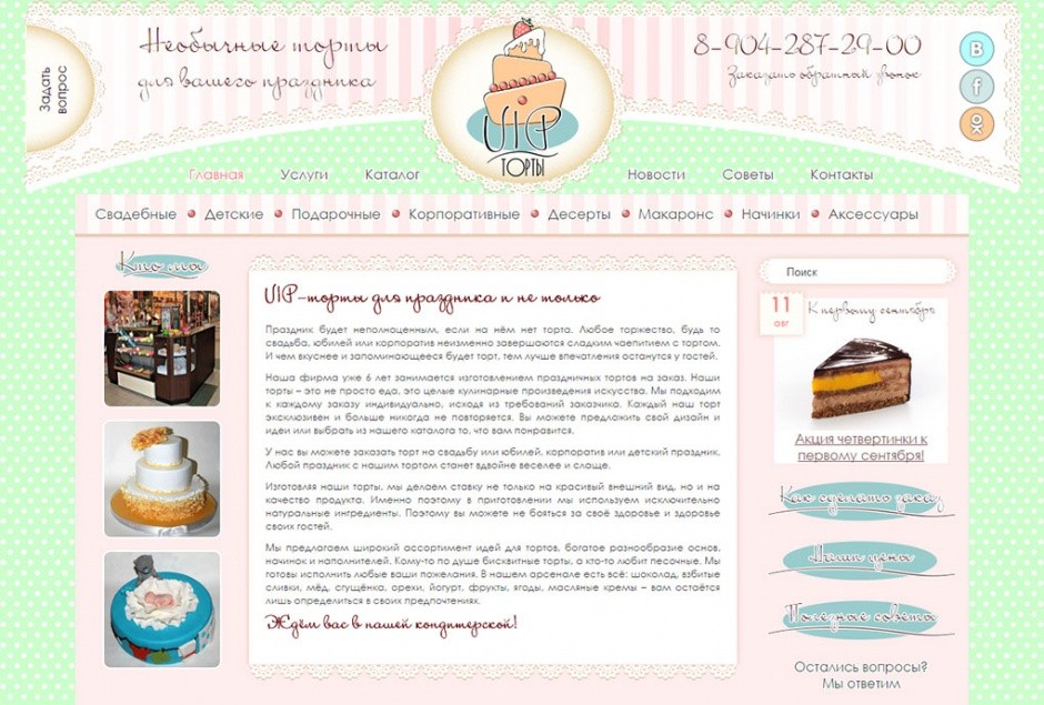 VIP-торты - необычайные торты для праздника и не только на заказ. Праздник будет неполноценным, если на нём нет торта. Любое торжество, будь то свадьба, юбилей или корпоратив неизменно завершаются сладким чаепитием с тортом. И чем вкуснее и запоминающееся будет торт, тем лучше впечатления останутся у гостей. Детские десерты, сладкие подарки, различные начинки и аксессуары к готовому блюду. Продукция от VIP-торты изготовлена по традиционным рецептам и индивидуальным разработкам шеф-повара компании. Можно выбрать сладкие десерты на любой вкус и оформить оперативную доставку к торжеству или любому другому мероприятию.