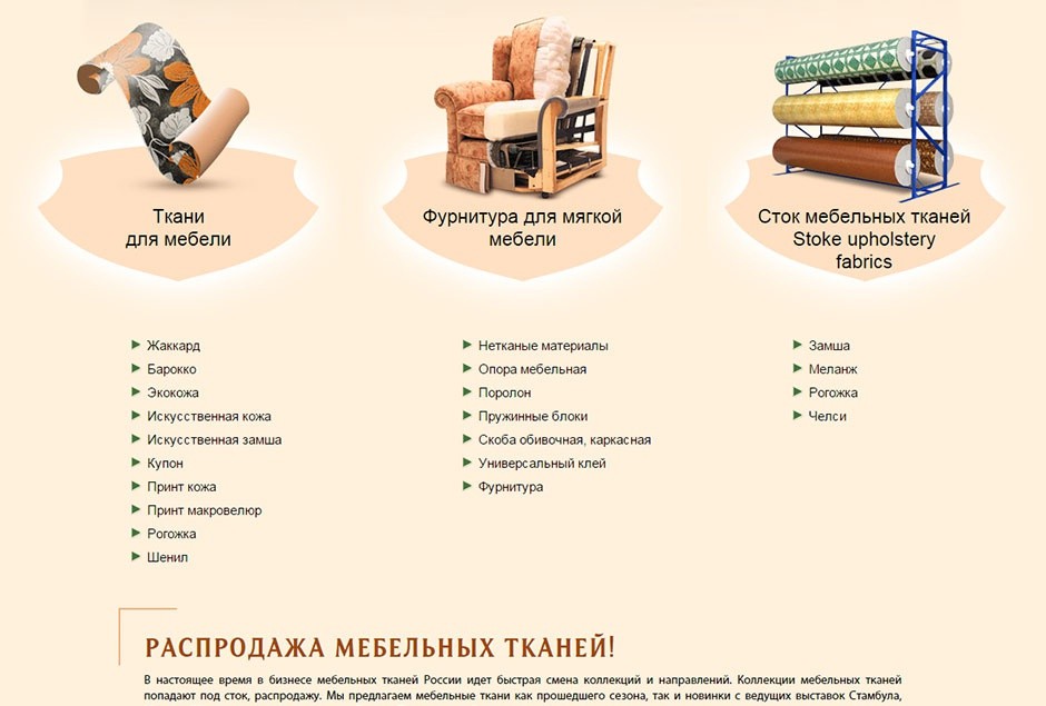 upiter-l.ruСток тканей для мебели и качественная фурнитура для производства мягкой мебели. Качественные текстильные материалы из замши, меланда, рогожки и челси. Выбор тканей из прошлых выставочных сезонов и новых коллекций ведущих европейских дизайнеров. Помимо широкого выбора текстиля и фурнитуры в каталоге магазина «Юпитер-Л», можно приобрести поролон разных габаритов и плотности, для создания уникальных идей и их реализации в мягкой мебели. Современные гарнитуры для оборудования интерьера и экстерьера, их надежность и срок службы напрямую зависят от свойств используемых материалов. Поставки мебельных тканей и фурнитуры в Москве и регионах ЦФО.